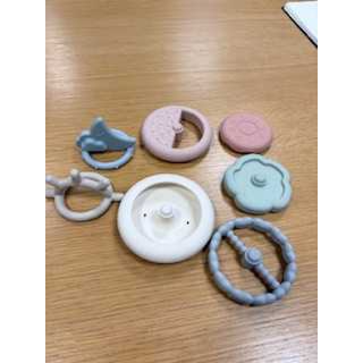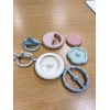 Silicone teething stacking toy. Helps develop fine and gross motor skills, can also be chewed. 7 numbered pieces, including numbered rings and a sun and moon topper (interchangeable).
